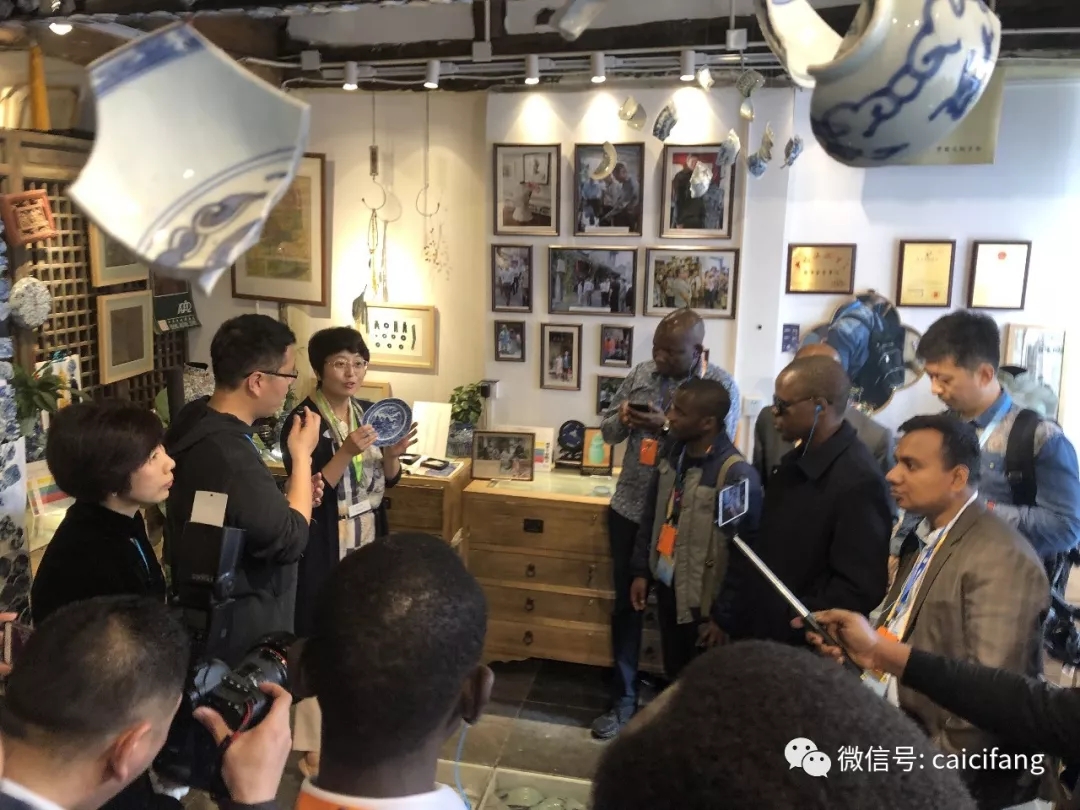 采瓷坊工作人员向来访的非洲记者讲述作为古代海上丝绸之路中最重要的商品——陶瓷,从唐宋到明清,中国制作的龙泉窑青瓷、景德镇青花瓷一路经南中国海、东南亚马六甲、印度群岛、霍尔姆斯海峡、到达非洲东部地区。来自肯尼亚的记者极其认真的倾听翻译的描述,惊奇的赞叹中国古代陶瓷,被精美繁复的纹饰所吸引,在明代早期中国陶瓷已经作为贸易商品被运到东非古国马林迪。