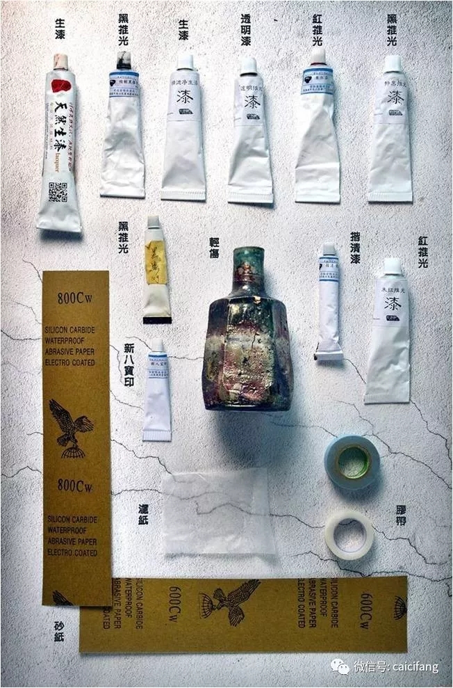 金缮修复需要使用的材料有:天然生漆、面粉或糯米粉、瓦灰或黄土粉、松节油、纯金销粉、纯银销粉、木片、纯丝棉、砂纸、粉筒、毛棒、勾线笔、调漆刀等等。